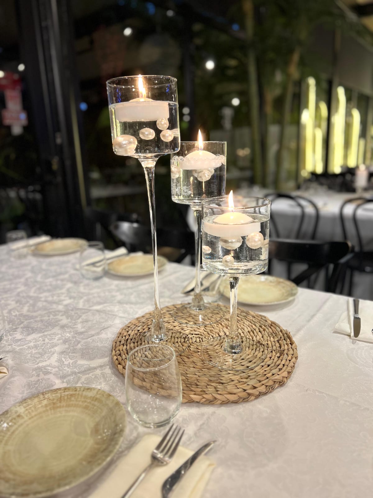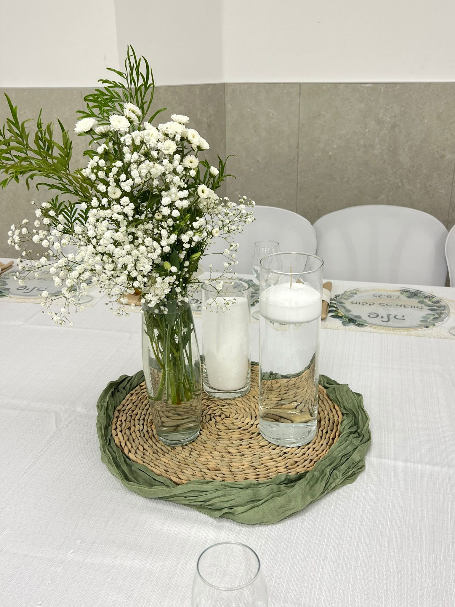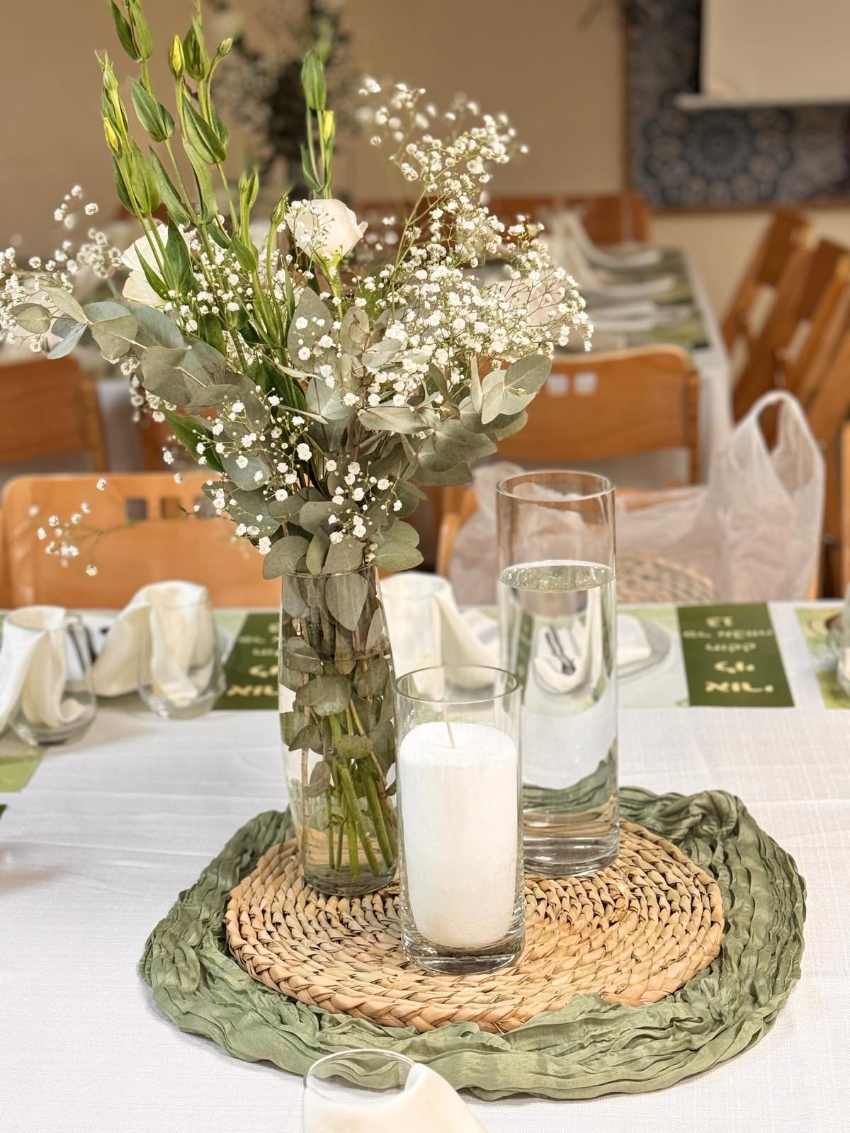 כחלק מהעיצוב שולחנות לאירועים, שילוב של אביזרים כמו פמוטים, נרות ופרחים יכול לשדרג את המראה הכללי. פרחים טריים מוסיפים חיים וצבע ואביזרים נכונים יכולים להוסיף גובה ומימד נוסף לעיצוב.